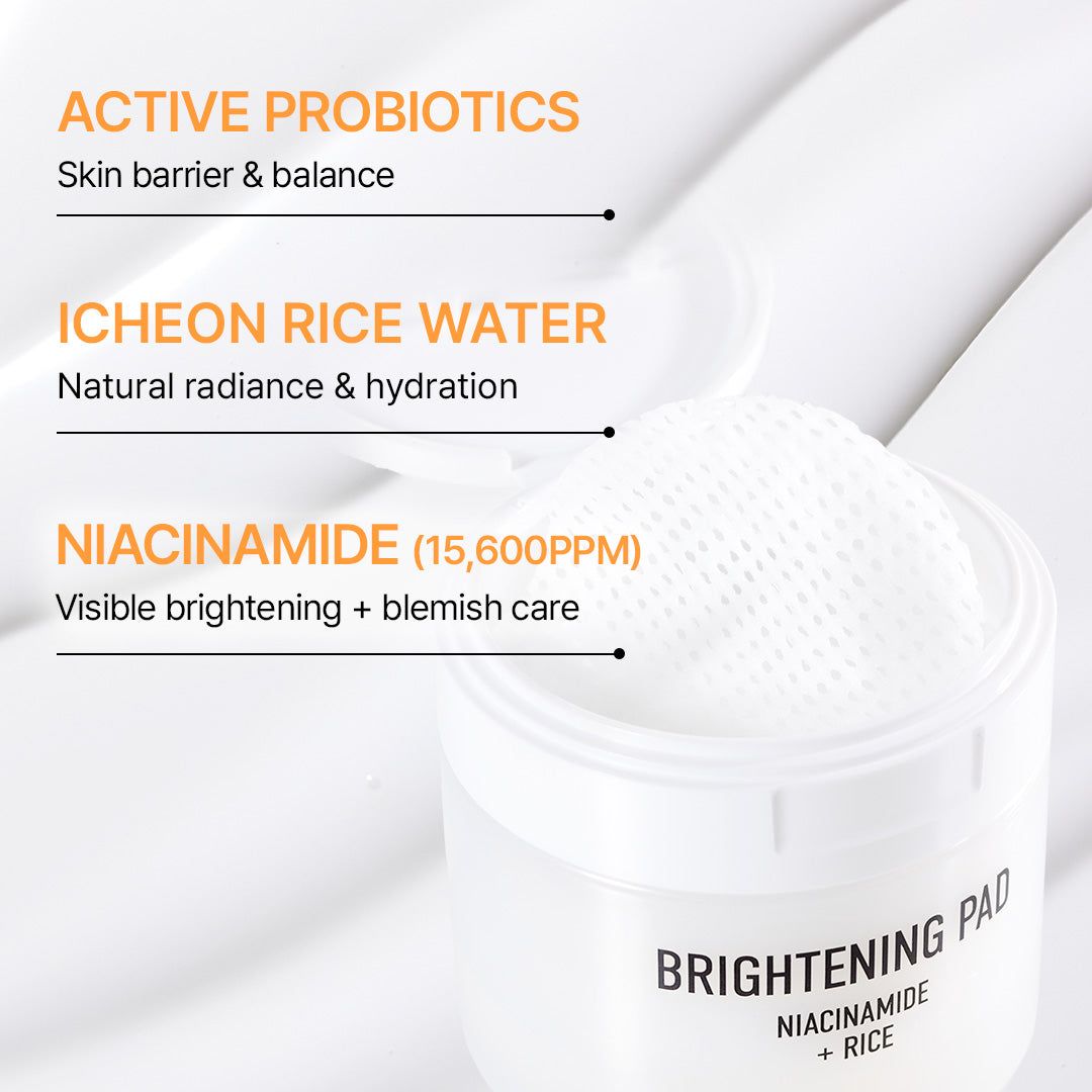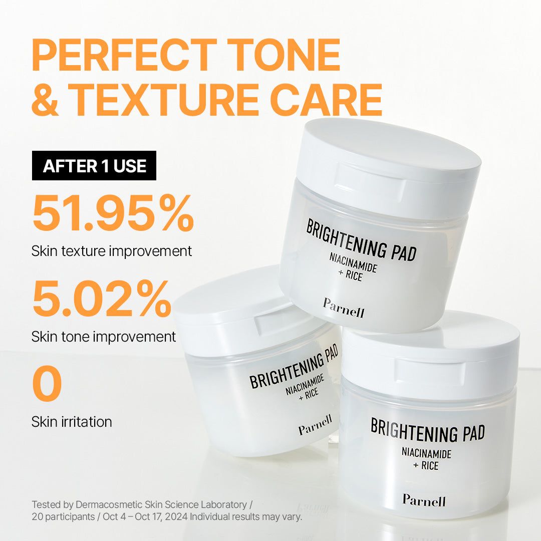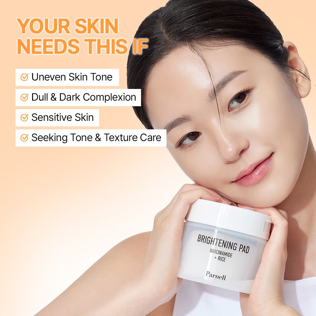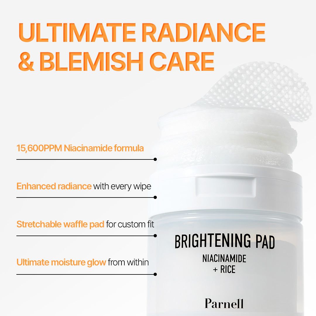 The Parnell Niacinamide 1.56 Rice Brightening Pad/ by Parnell exfoliates dead skin cells and hydrates in one convenient step. A brightening pad that revives your skin’s natural glow with every swipe. Infused with Niacinamide, rice extract and probiotics, it provides gentle yet effective brightening care. The uniquely textured 'waffle' pads lock in a clear essence that hydrates and evens skin tone, challenging the notion that brightening causes dryness.